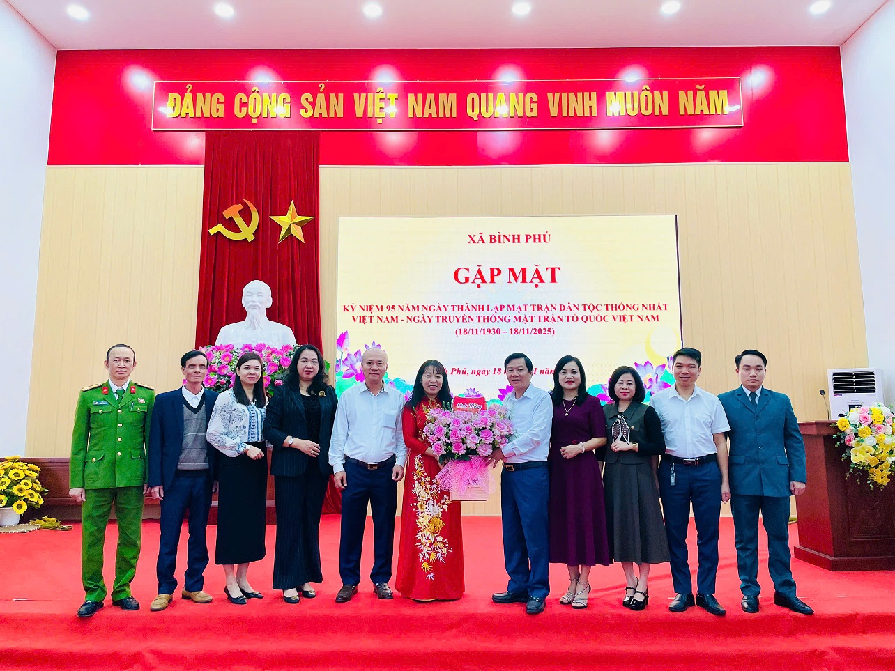 Nhân dịp kỷ niệm 95 năm ngày thành lập Mặt trận Dân tộc thống nhất Việt Nam - ngày truyền thống MTTQ Việt Nam (18/11/1930 – 18/11/2025), đồng chí Nguyễn Hồng Phong - Bí thư Đảng uỷ, Chủ tịch HĐND xã Bình Phú đã tặng hoa chúc mừng và ghi nhận những đóng góp của MTTQ xã trong việc xây dựng khối đại đoàn kết toàn dân tộc. Tham dự chương trình có đồng chí Trịnh Đức Lai – Phó Bí thư Đảng uỷ, Chủ tịch UBND xã; đồng chí Dương Thị Kim Dung – Phó Bí thư Thường trực Đảng uỷ, các đồng chí Uỷ viên Ban Thường vụ Đảng uỷ; đại diện các tổ chức chính trị xã hội; các phòng, ngành, đơn vị chuyên môn của xã.