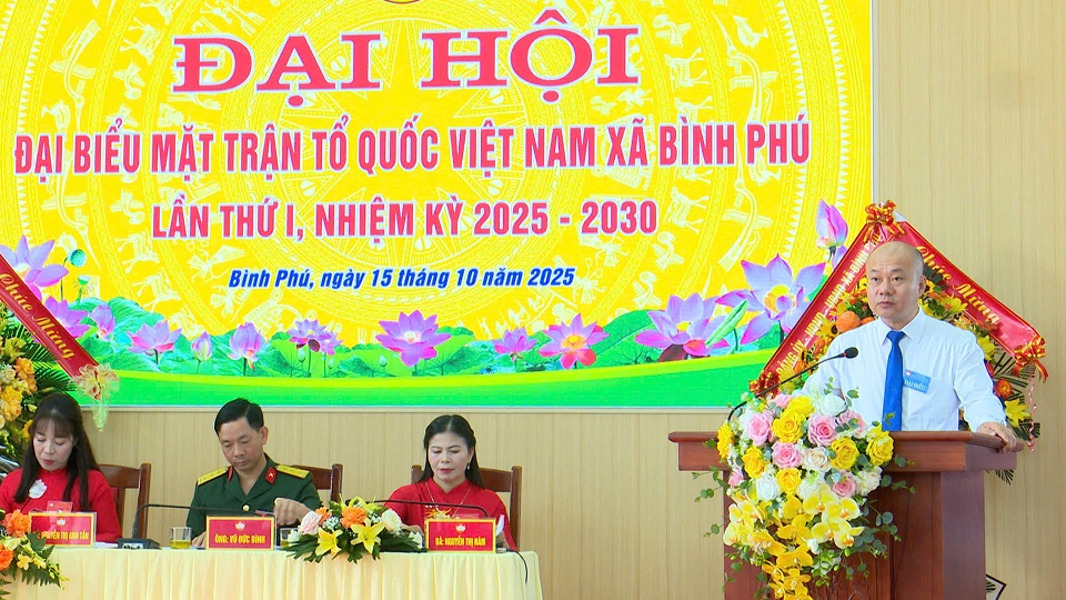 Ngày 15/10/2025, Uỷ ban mặt trận Tổ quốc (UBMTTQ) Việt Nam xã Bình Phú long trọng tổ chức Đại hội đại biểu lần thứ I, nhiệm kỳ 2025 - 2030. Tới dự Đại hội có đồng chí Bùi Đức Hinh – Phó Bí thư Tỉnh ủy, Ủy viên Đoàn Chủ tịch Ủy ban MTTQ Việt Nam, Chủ tịch UBMTTQ Việt Nam tỉnh Phú Thọ; đồng chí Nguyễn Hồng Nhung- Tỉnh ủy viên, Phó Chủ tịch UBMTTQ Việt Nam tỉnh, Chủ tịch Hội Liên hiệp Phụ nữ tỉnh; lãnh đạo Văn phòng Tỉnh uỷ, Văn phòng UBMTTQ Việt Nam tỉnh. Về phía địa phương có đồng chí Nguyễn Hồng Phong - Bí thư Đảng uỷ, Chủ tịch HĐND xã; đồng chí Trịnh Đức Lai - Phó Bí thư Đảng uỷ, Chủ tịch UBND xã; đồng chí Dương Thị Kim Dung - Phó Bí thư Thường trực Đảng uỷ; các đồng chí Uỷ viên Ban Thường vụ Đảng uỷ; Trưởng các phòng, cơ quan, đơn vị thuộc xã, các trường học, đại diện các doanh nghiệp trên địa bàn; các đồng chí Bí thư chi bộ khu dân cư, lãnh đạo UBMTTQ xã qua các thời kỳ và 125 đại biểu tiêu biểu đại diện cho khối đại đoàn kết và các tầng lớp Nhân dân trong xã đã về dự Đại hội.