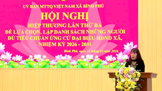Sáng ngày 12/02/2026, Ủy ban MTTQ Việt Nam xã Bình Phú tổ chức Hội nghị hiệp thương lần thứ ba để lựa chọn, lập danh sách những người đủ tiêu chuẩn ứng cử đại biểu HĐND xã, nhiệm kỳ 2026 - 2031. Tham dự hội nghị có đồng chí Nguyễn Hồng Phong - Bí thư Đảng ủy, Chủ tịch HĐND xã; đồng chí Trịnh Đức Lai - Phó Bí thư Đảng ủy, Chủ tịch UBND xã; đồng chí Dương Thị Kim Dung - Phó Bí thư Thường trực Đảng ủy cùng các đồng chí trong Ban Chỉ đạo bầu cử xã; lãnh đạo Đảng ủy, HĐND, UBND, Ủy ban bầu cử xã; đại diện Ban Xây dựng Đảng và lãnh đạo các tổ chức thành viên của Ủy ban MTTQ xã.