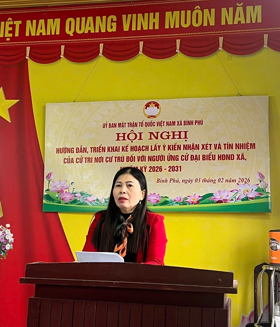 Ngày 03/02/2026, Ủy ban MTTQ Việt Nam xã Bình Phú tổ chức hội nghị hướng dẫn, triển khai kế hoạch tổ chức hội nghị lấy ý kiến nhận xét của cử tri nơi cư trú đối với người được giới thiệu ứng cử đại biểu HĐND xã, nhiệm kỳ 2026 – 2031.