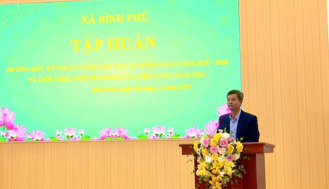 Sáng ngày 06/12/2025, Trung tâm dịch vụ sự nghiệp công xã Bình Phú phối hợp với Hội Nông dân xã tổ chức hội nghị tập huấn hướng dẫn chăm sóc lúa vụ đông xuân năm 2025 - 2026 và giới thiệu một số giống lúa tiềm năng vụ Xuân năm 2026. Tham dự hội nghị có lãnh đạo Trung tâm dịch vụ sự nghiệp công xã, lãnh đạo Hội Nông dân xã, lãnh đạo phòng Kinh tế và hơn 70 học viên là trưởng khu dân cư, khuyến nông viên cơ sở, chi hội trưởng Nông dân khu dân cư, cộng tác viên khuyến nông trên địa bàn.