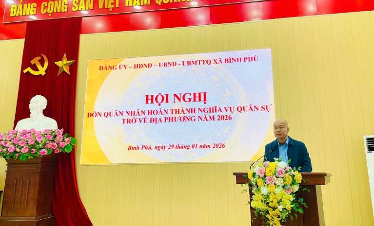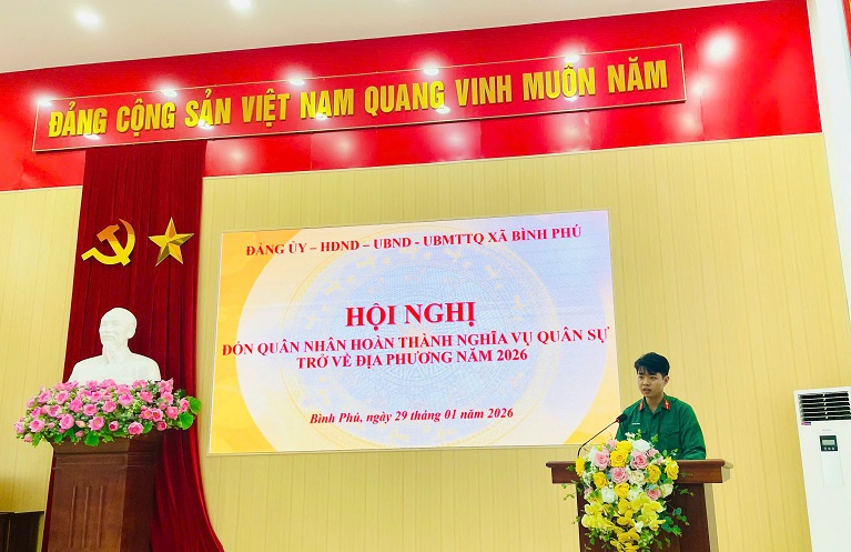 Sáng ngày 29/1/2026, Xã Bình Phú tổ chức đón 14 quân nhân hoàn thành nghĩa vụ quân sự trở về địa phương năm 2026. Tham dự buổi đón nhận quân nhân có đồng chí Nguyễn Hồng Phong – Bí thư Đảng uỷ, Chủ tịch HĐND xã; đồng chí Hà Xuân Huấn – Uỷ viên BTV Đảng uỷ, Phó Chủ tịch UBND xã; đồng chí Chủ tịch UBMTTQ xã, các tổ chức chính trị xã hội xã; Trưởng các phòng, đơn vị thuộc xã.