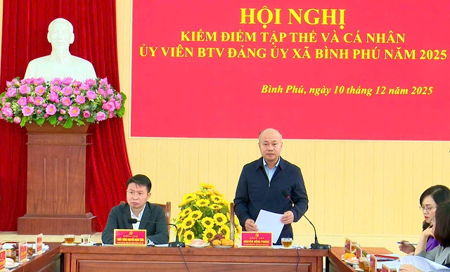 Báo cáo kiểm điểm cho thấy, năm 2025 là năm đầu tiên thực hiện chính quyền địa phương 2 cấp, tuy gặp rất nhiều khó khăn nhưng Ban Thường vụ Đảng ủy xã Bình Phú đã đoàn kết, nhất trí cao để tập trung khắc phục khó khăn, lãnh đạo, chỉ đạo hoàn thiện tổ chức bộ máy, xây dựng quy chế làm việc, sắp xếp, kiện toàn đội ngũ cán bộ; tổ chức thành công Đại hội đại biểu Đảng bộ xã lần thứ I, nhiệm kỳ 2025-2030. Kịp thời cụ thể hóa các thông báo, kết luận, chỉ thị, nghị quyết của Trung ương và tỉnh với quyết tâm, nỗ lực và hành động quyết liệt của Ban Thường vụ Đảng ủy xã, các lĩnh vực kinh tế - xã hội, quốc phòng - an ninh được bảo đảm, công tác xây dựng Đảng và hệ thống chính trị trong sạch, vững mạnh đạt nhiều kết quả tích cực. Tổng thu ngân sách nhà nước trên địa bàn ước đạt 39.936 triệu đồng, đạt 173,8% dự toán; tổng vốn đầu tư toàn xã hội ước đạt 416.300 triệu đồng đạt 101,5% kế hoạch; tỷ lệ hộ nghèo 1,5%; tỷ lệ gia đình văn hoá 97,4%. Tỷ lệ chi bộ Đảng đạt hoàn thành tốt nhiệm vụ trở lên ước đạt từ 90% trở lên; tỷ lệ đảng viên hoàn thành tốt nhiệm vụ trở lên ước đạt từ 90% trở lên. Với những kết quả đạt được, Ban Thường vụ Đảng ủy xã Bình Phú đề nghị xếp loại Hoàn thành tốt nhiệm vụ.