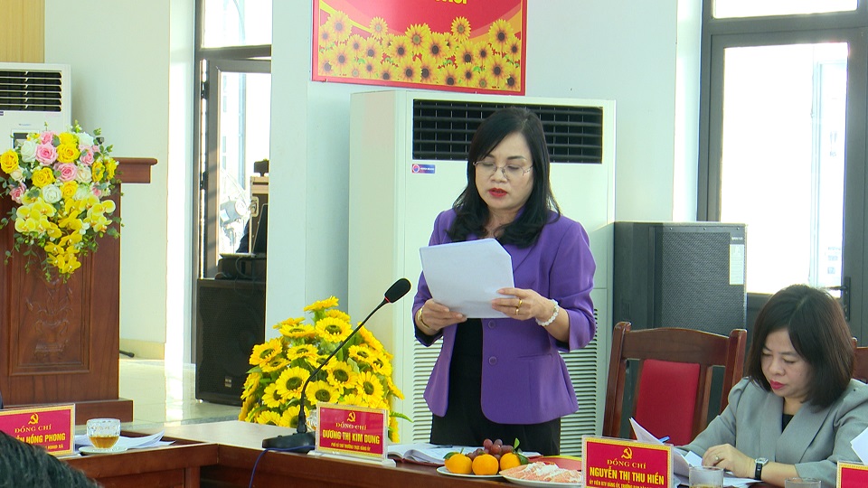 Đồng chí Dương Thị Kim Dung - Phó Bí thư Thường trực Đảng uỷ báo cáo kiểm điểm tập thể Ban Thường vụ Đảng uỷ xã.