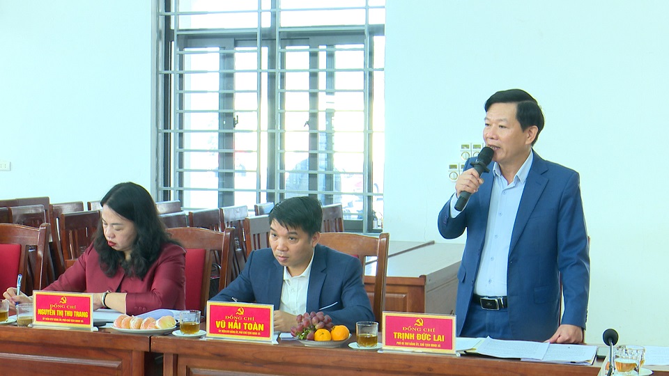 Đồng chí Trịnh Đức Lai - Phó Bí thư Đảng uỷ, Chủ tịch UBND xã phát biểu tại hội nghị.